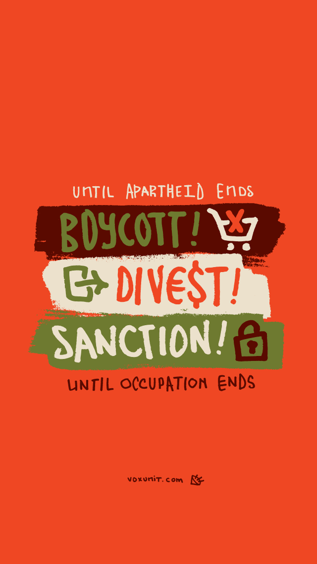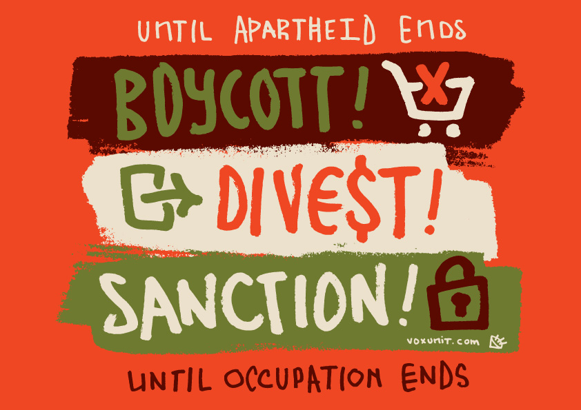 cause: Boycott, divestment and sanction to demand Israel to end occupation and apartheid.